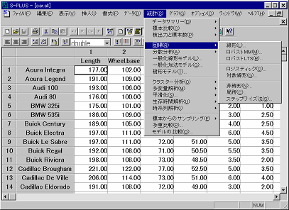 そこでS-PLUSは、S言語を知らなくてもS言語の持つ解析やグラフの機能が使えるようにもなっています。プルダウンメニューからマウスクリックするだけで、解析やグラフ作成の命令の実行ができます。いちいちS言語のコマンドを覚えなくても、図1-1のように[統計]や[グラフ]というメニューの中から適切なものを選択することで、分析やグラフ作成が実行できます。各メニューにはS言語のコマンドが割り当てられているので、S言語を知らなくてもS言語の機能が使えるようになっているのです。