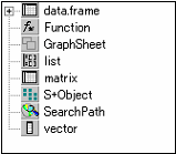 オブジェクト・ブラウザは、見た目はWindows付属のエクスプローラによく似ています。オブジェクト・ブラウザは、S-PLUSで扱うデータ等を管理するユーティリティウインドウです。