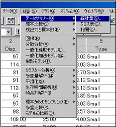 要約とは、平均値や分散などの基本統計量を求めることを指します。S-PLUSでデータの要約をするには、[統計]メニューの[データサマリー]から[統計量]を選択します。
