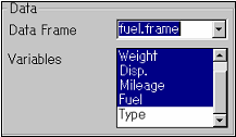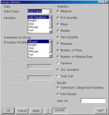Summary Statisticsのダイアログでは、左上にDataセクションがあります。ここには、Data FrameとVariablesの二つのリストボックスがあります。Data Frameのリストでは、今オープンしているブラウザ・ページ内にあるデータフレーム・オブジェクトを選択することができます。つまり、データ・ウィンドウでデータフレームをオープンしていなくても、実行することができます。通常は、今データウィンドウで開いているデータオブジェクト(ここではfuel.frame)が表示されています。図7-2もそうなっています。