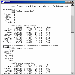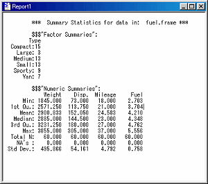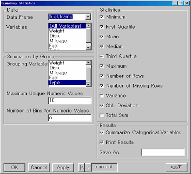 変数Typeは、車のタイプを表す変数です。このような変数を使って、グループ毎の要約統計量を出すこともS-PLUSでは簡単にできます。Summary Statisticsダイアログには、Dataセクションの下にSummaries by Groupというセクションがあります。ここのGrouping Variablesリストで変数を指定すると、その変数のカテゴリーに従って出力が分割されます。