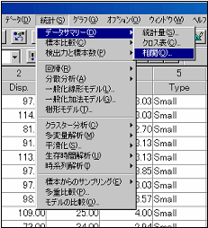 相関は、[統計]メニューの[データサマリー]から[相関]を選択します。