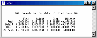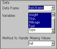 今回は、変数の選択で以外の変数を選択します。変数選択の方法は、前章の統計量のところで説明したとおりです。Variablesのリスト内のWeightをクリックして、Shiftキーを押しながらをFuelをクリックすると、WeightからFuelまでの4つの変数を選択できます。間違ってTypeまで選択しても、Shiftキーを押しながらTypeをクリックすれば、Typeは除外できます。