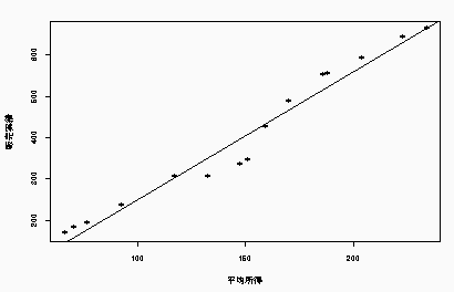 この図を見ると平均所得と販売実績の相関は非常に高く、その関係は直線で示すことが可能です。
