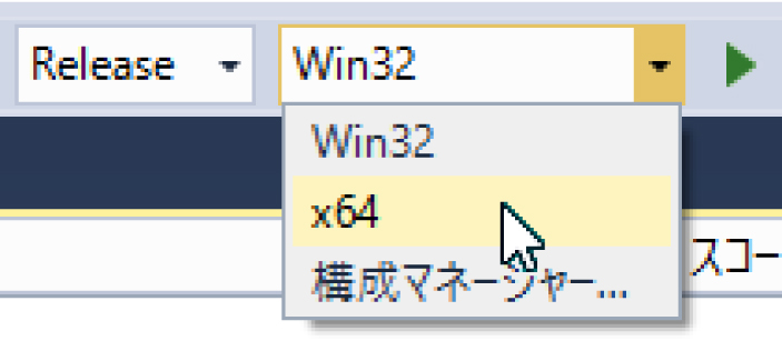 まず,Win32プロジェクト設定ではなく64ビットプロジェクト構成にする必要があります.変更の際は,画面上部にあるコンボボックスをクリックし,「x64」を選択します.