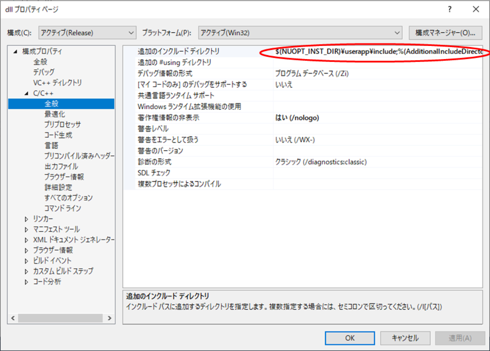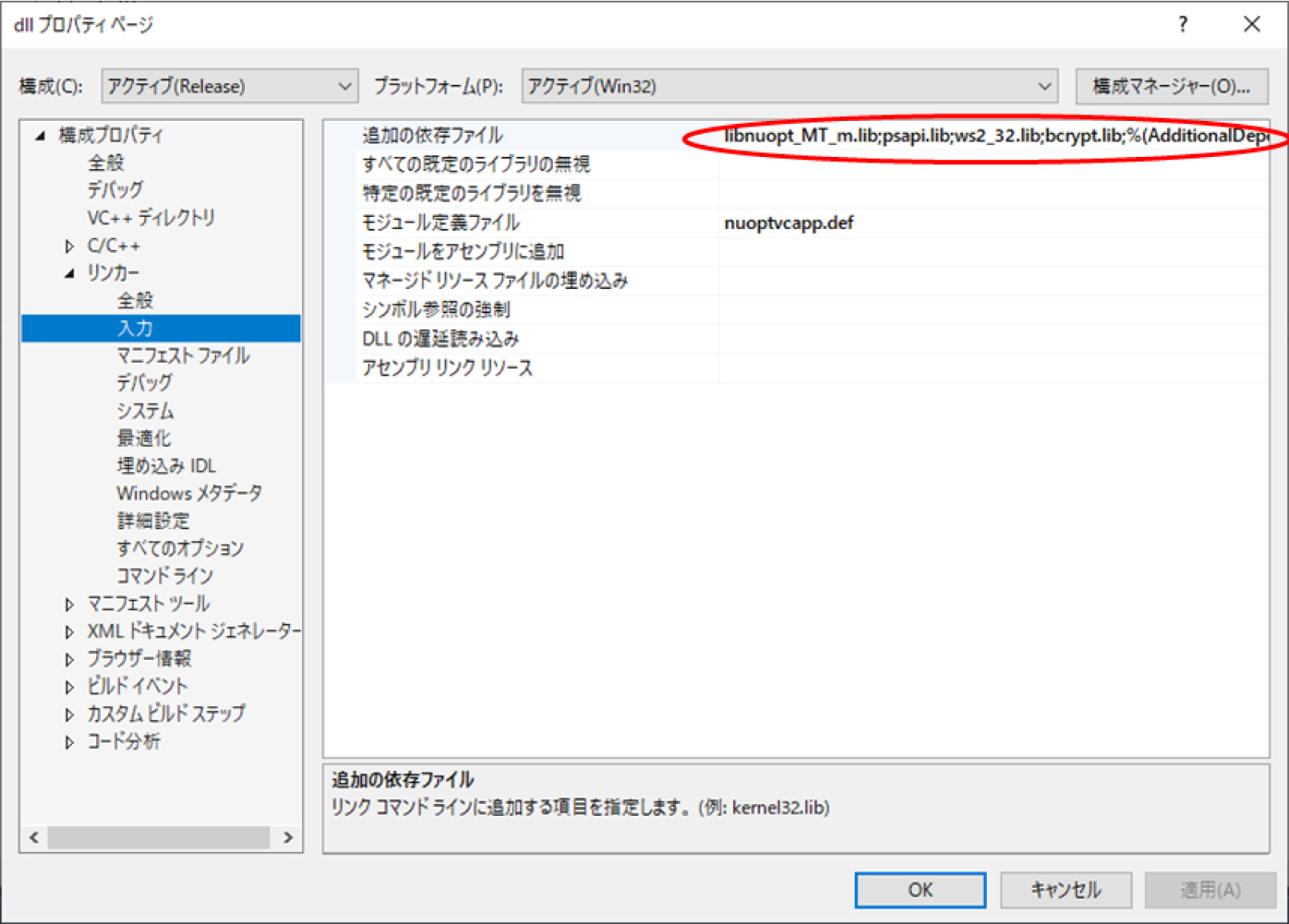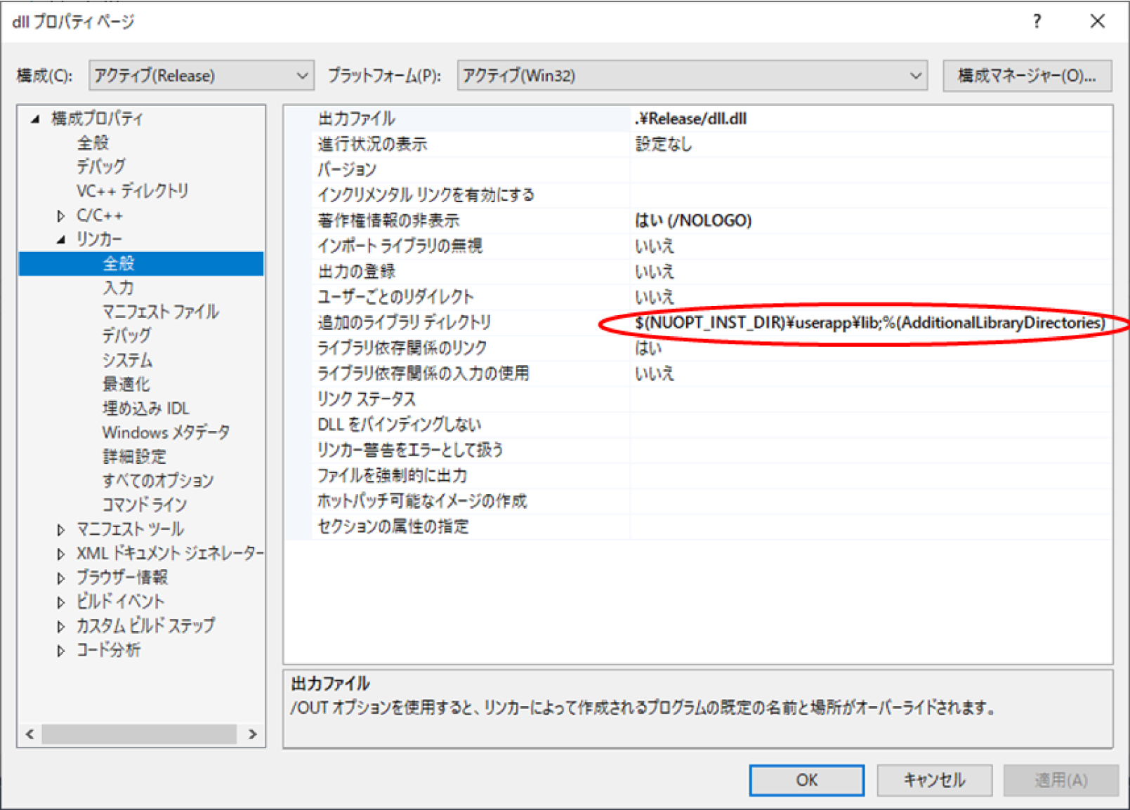 を追加します.なお本設定はNuorium Optimizerのライブラリに接続しているアプリケーションで使用するライブラリがデフォルトの「マルチスレッド」でコンパイルする場合です.詳細は以降にある「※注意1」をご覧ください.