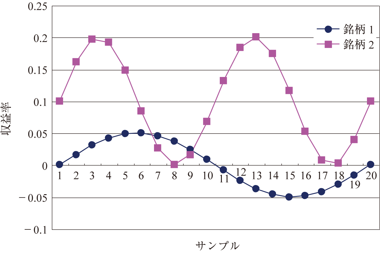銘柄1,2に対する収益率のサンプル20期分が以下の図のように得られているとします.