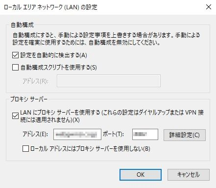 - プロキシーサーバを使用する設定がされている場合に「ローカルアドレスにはプロキシーサーバーを使用しない」にチェックが入っていることを確認します(※1)。