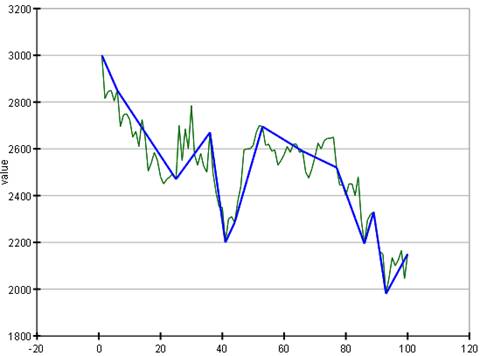 線分表現は、時系列を複数の線分で表現する方法である。 それぞれの線分を求める方法は、数多く存在するが、基本的には、隣接する時系列データ間の変動に注目し、変動の少ないもの同士を一直線で繋げるという方法である。