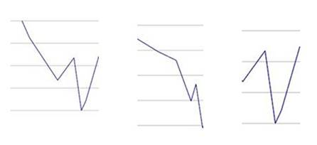 例えば、左は「下がる、上がる、下がる、上がる」と、中央は「下がる、下がる、上がる、下がる」と表される。具体的には線の傾きや間隔などがパターンを表現している。