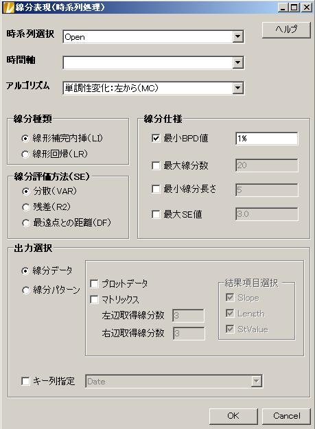 BPD値とはBreak Point Difference Valueの略 隣同士の点に縦の差の絶対地が最小BPD値より小さい場合には線分の端点としない。主に線分の外れ値を除去に有効。指定方法は正の実数、または、文字列でのパーセンテージ指定(例:3.55%)が可能。チェックを外すとこの条件は無効になる |