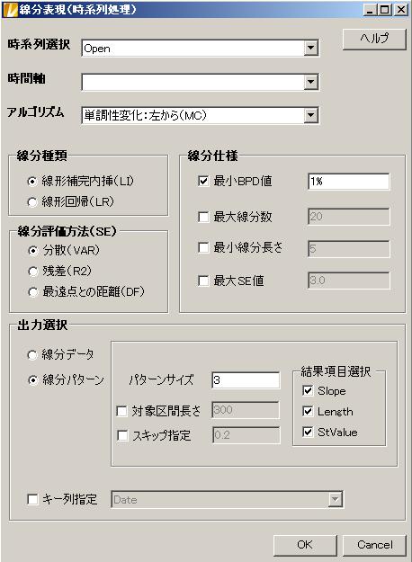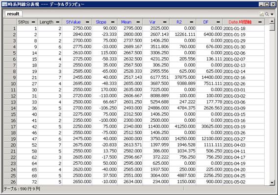 線分の開始位置 (StPos)、線分の長さ (Length)、開始値(StValue)、傾き(Slope)、平均(Mean)、線分評価(Var、R2、DF)の結果を出力する |