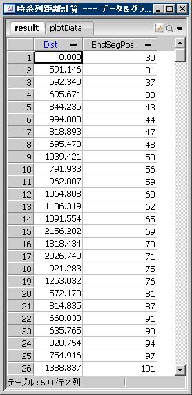 出力resultは、パターンと比較しているサンプルとの距離を表すDist列と、パターンと比較しているサンプルのインデックス列(時系列のインデックス)の最後の値であるEndSegPos列からなる。