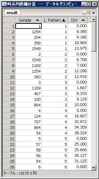 「結果指定」で指定した形式で、パターンテーブルの各行に対し、サンプルテーブルの各行との距離を出力する。